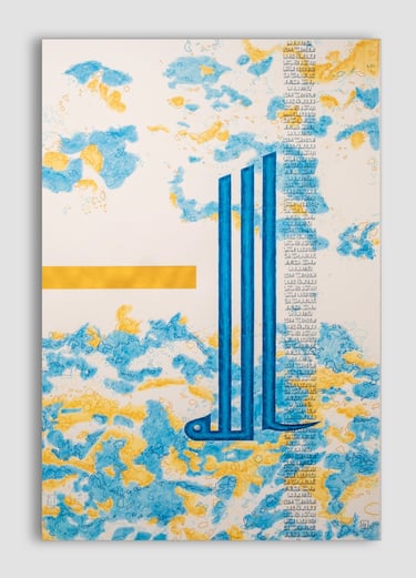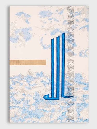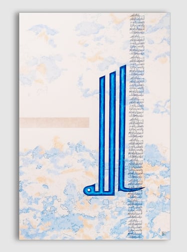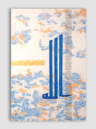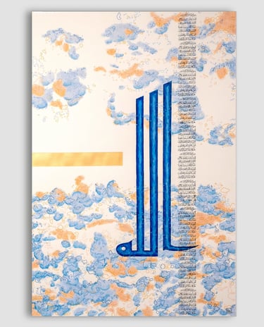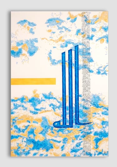 Tons de l'origine, bleu adamantin et or incréé. Calligraphie Koufi, 110cm/75cm