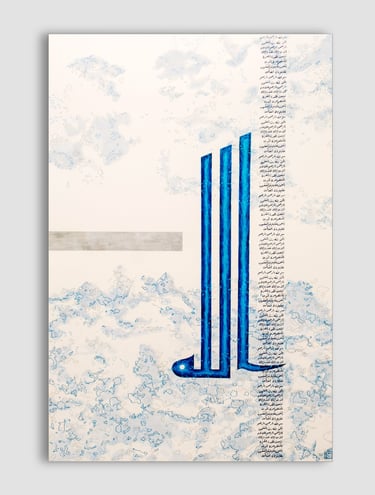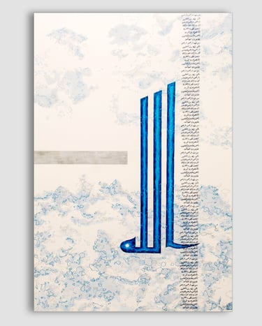 Tons du silence divin, argent lunaire et bleu abyssal, Calligraphie Diwani, 110cm/75cm