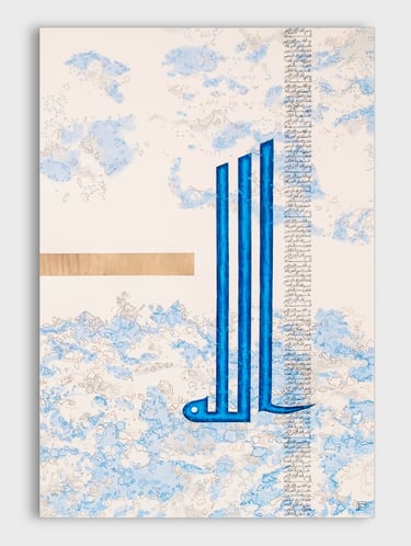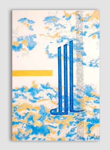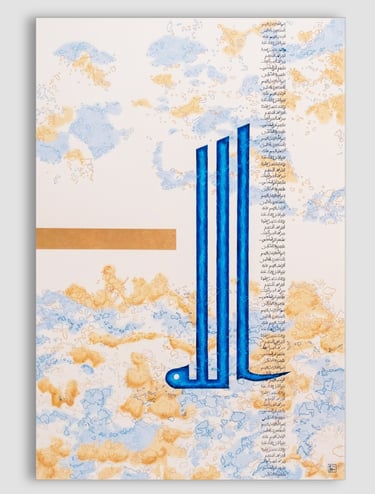 Tons de l'aube naissante, bleu abyssal et or pâle, Calligraphie Mursal, 110cm/75cm